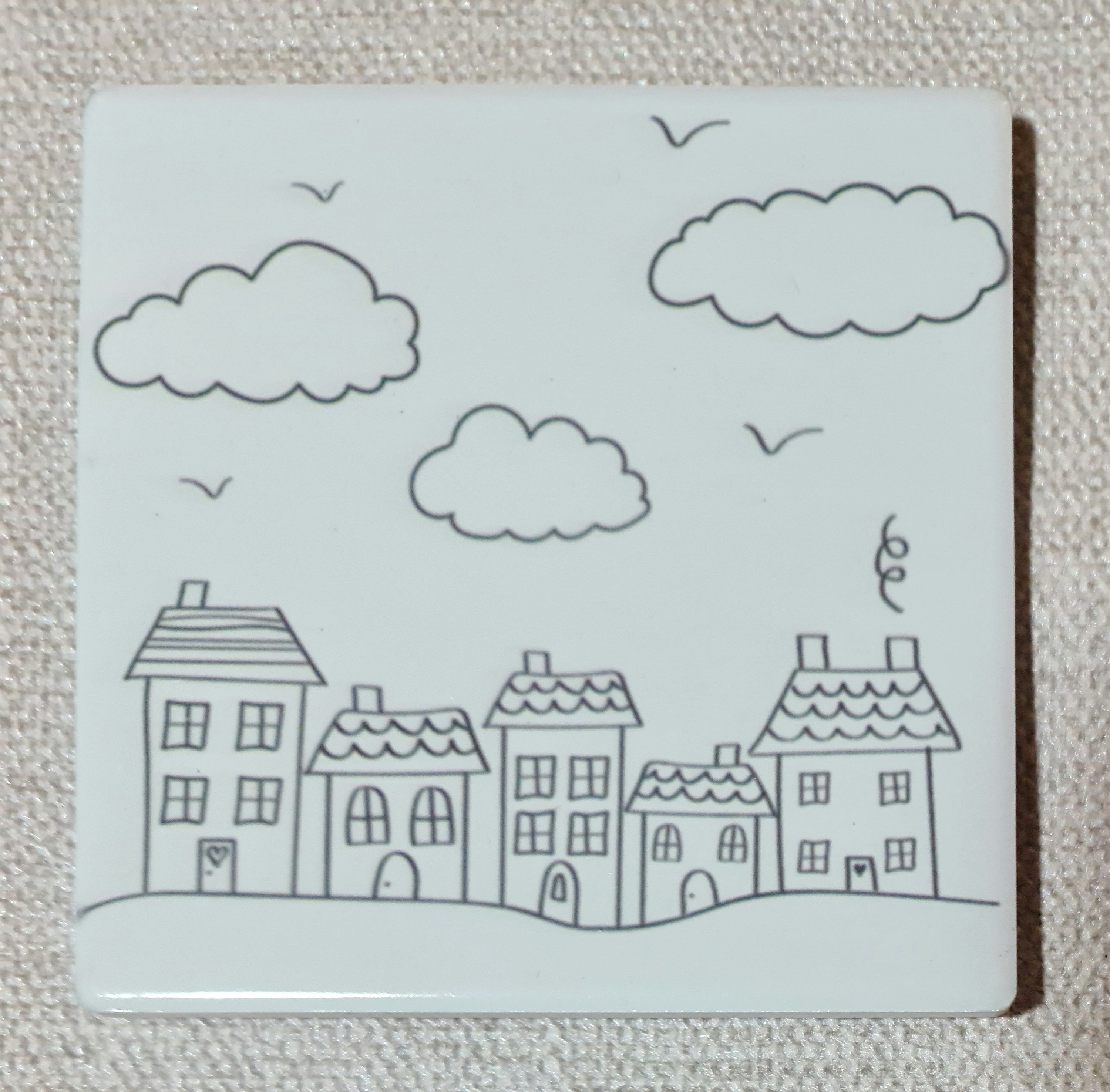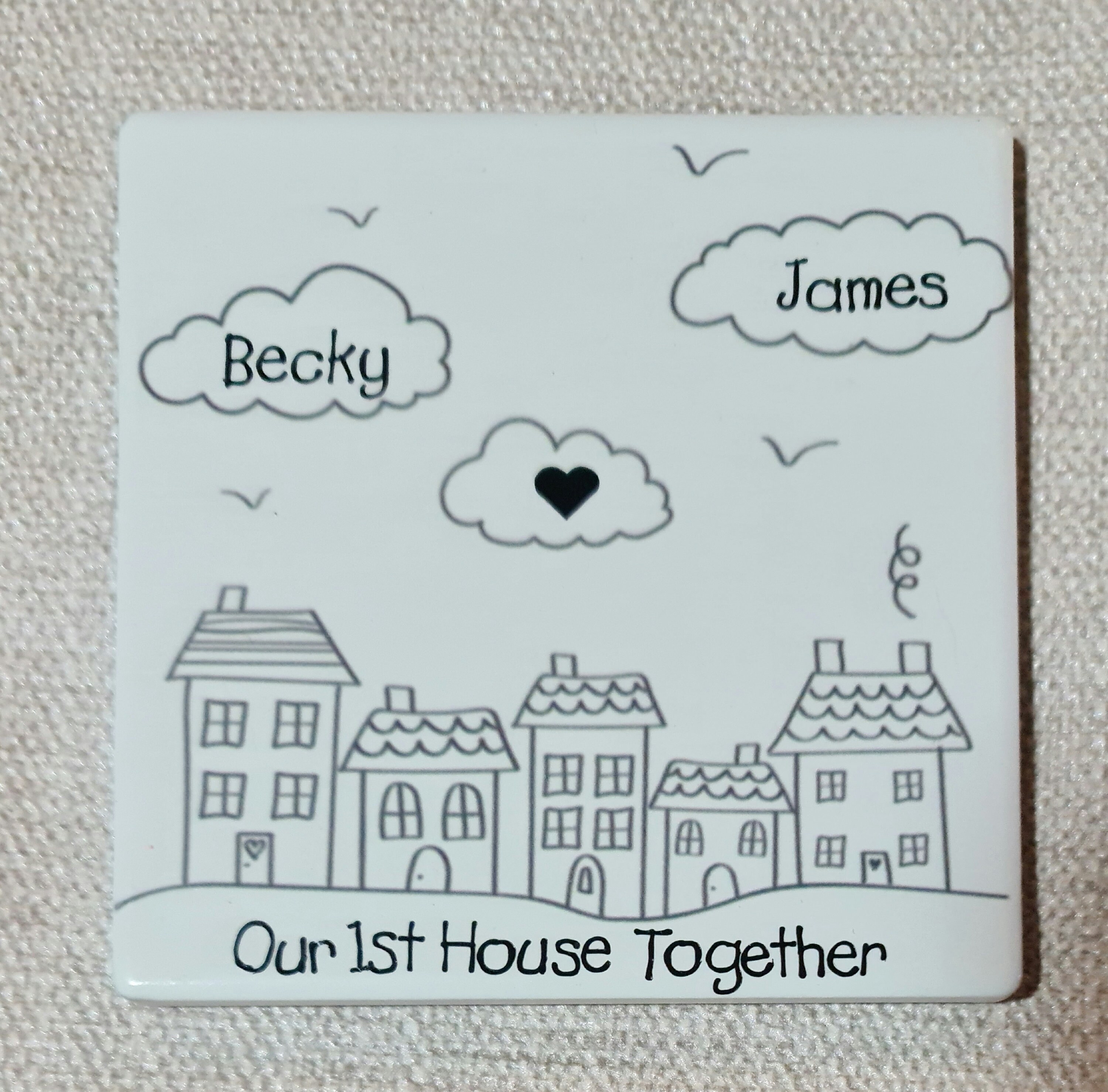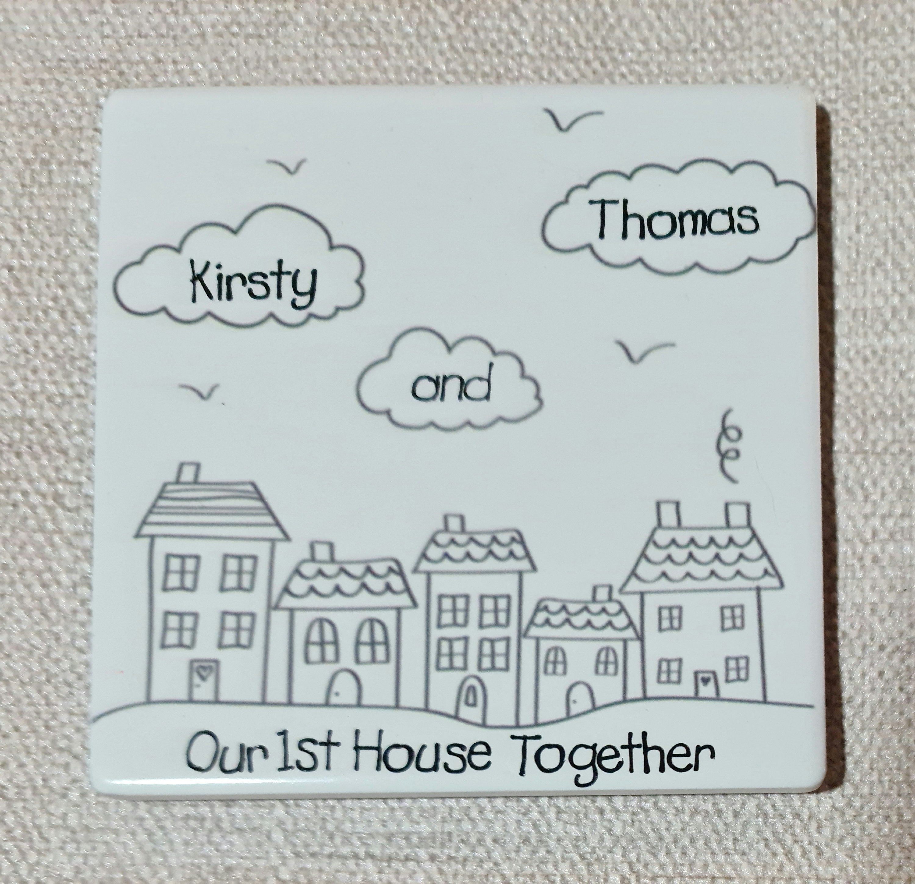 Add a personalised touch to your home décor with this square ceramic coaster from Cotterill Creations. Measuring just under 10 cm in width, this coaster features a delightful design of three fluffy clouds and a street of houses. The coaster is perfect for all occasions and can be customised with your own text to make it an ideal gift for your neighbours or for someone moving into their first home or new home.