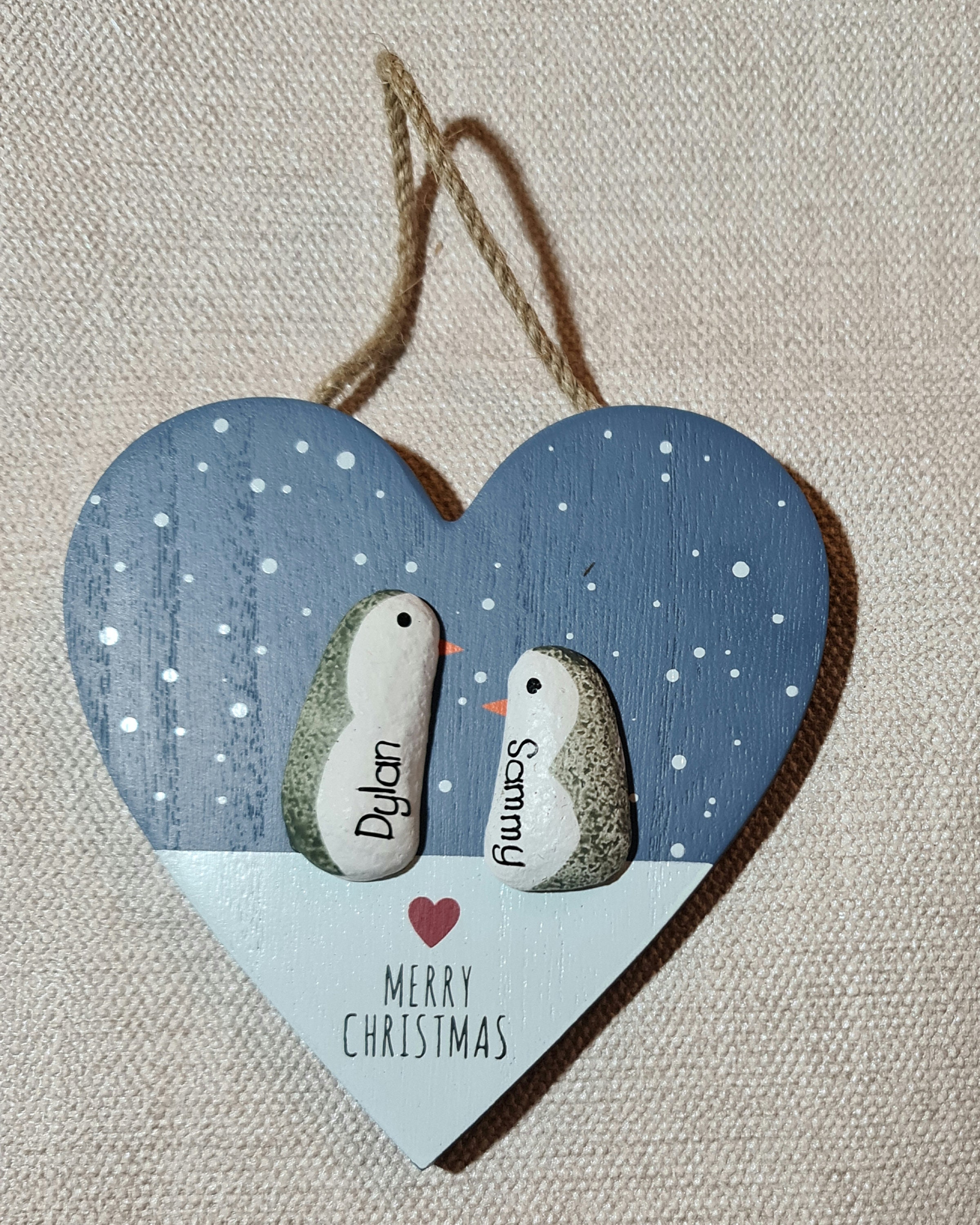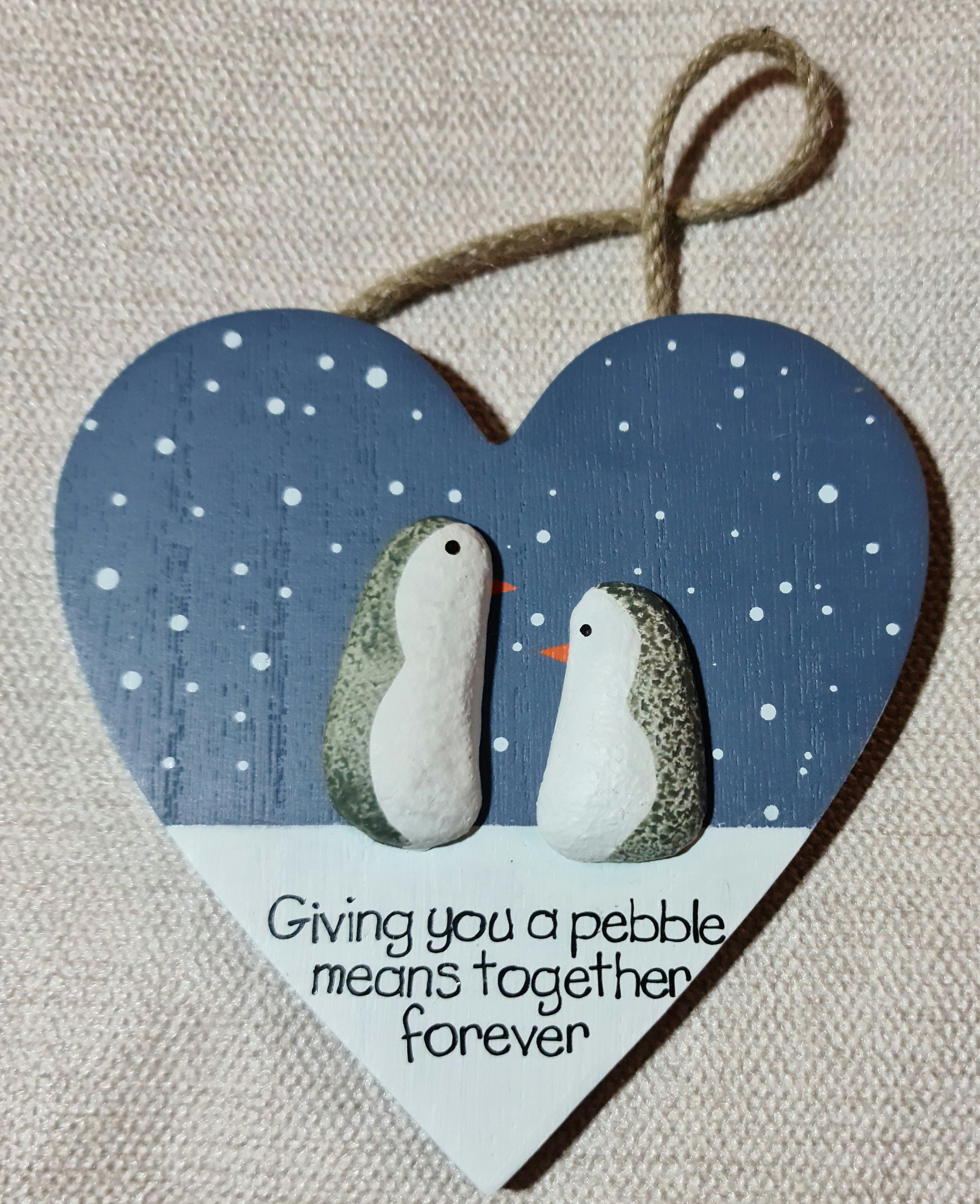 This unique wall hanging plaque is the perfect gift for your loved ones. Handcrafted in a beautiful pebble art style, it features two cute penguin characters on a heart-shaped design that will add a festive touch to any home decor.