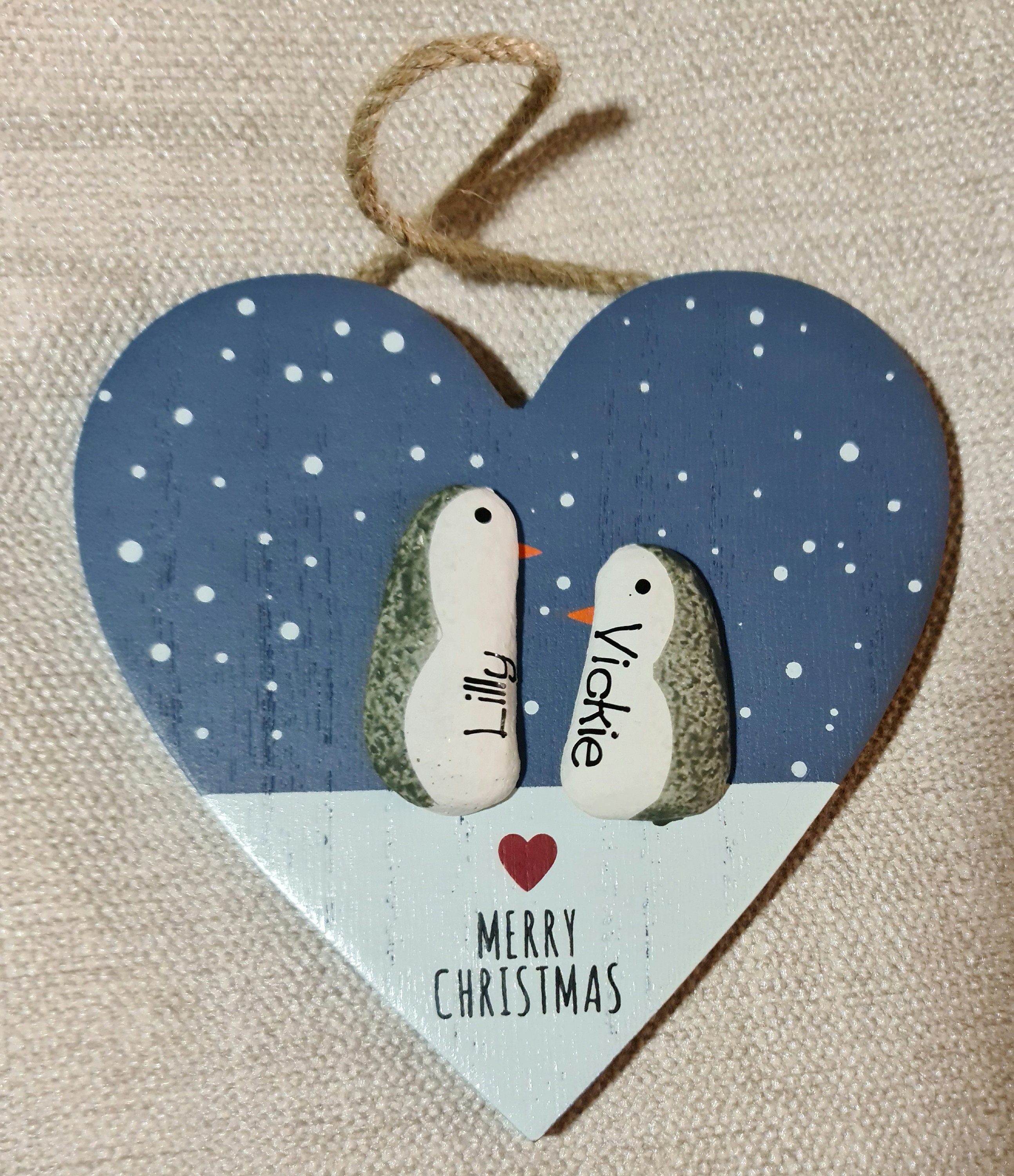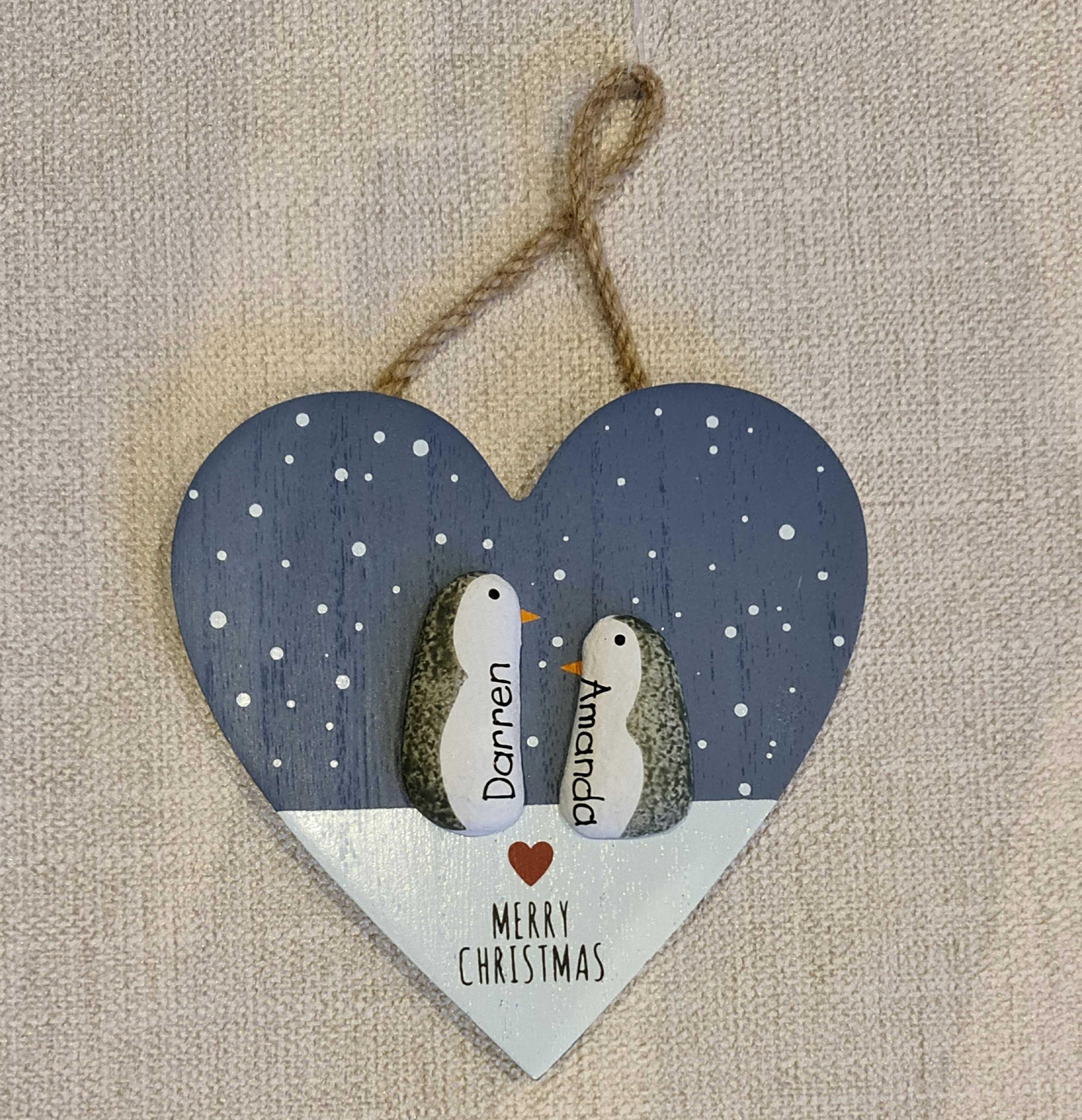 Personalised Penguin Gift Plaque. Pebble Art Style Penguins On A Heart Shaped Wall Plaque. Anniversa