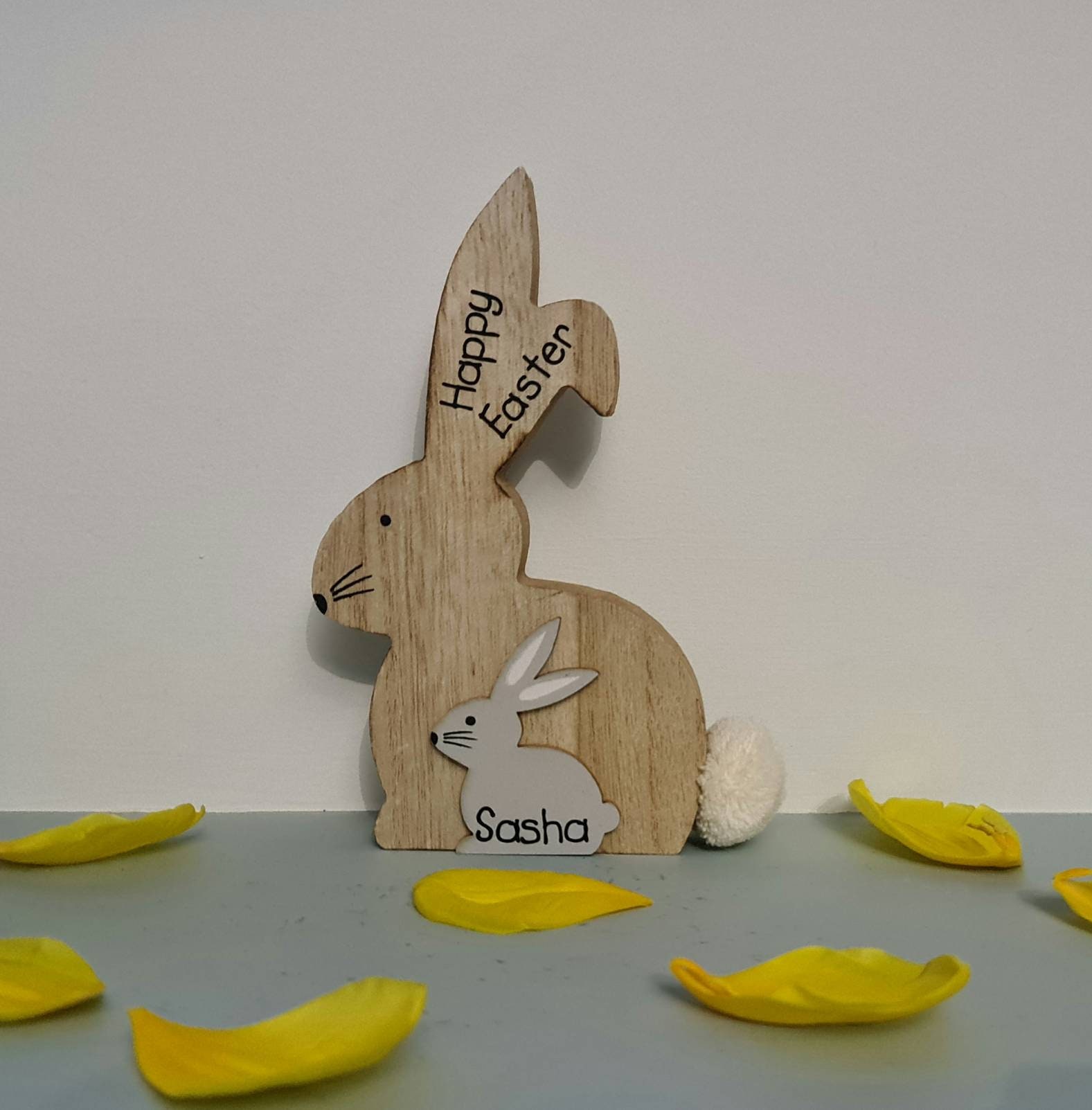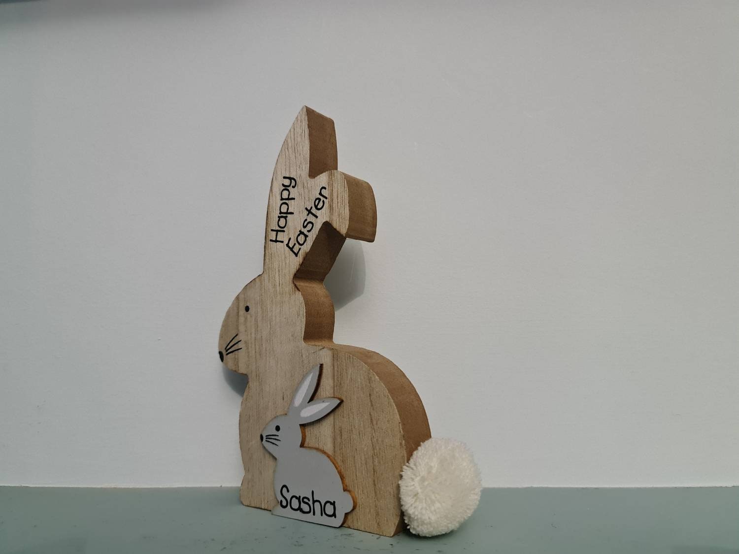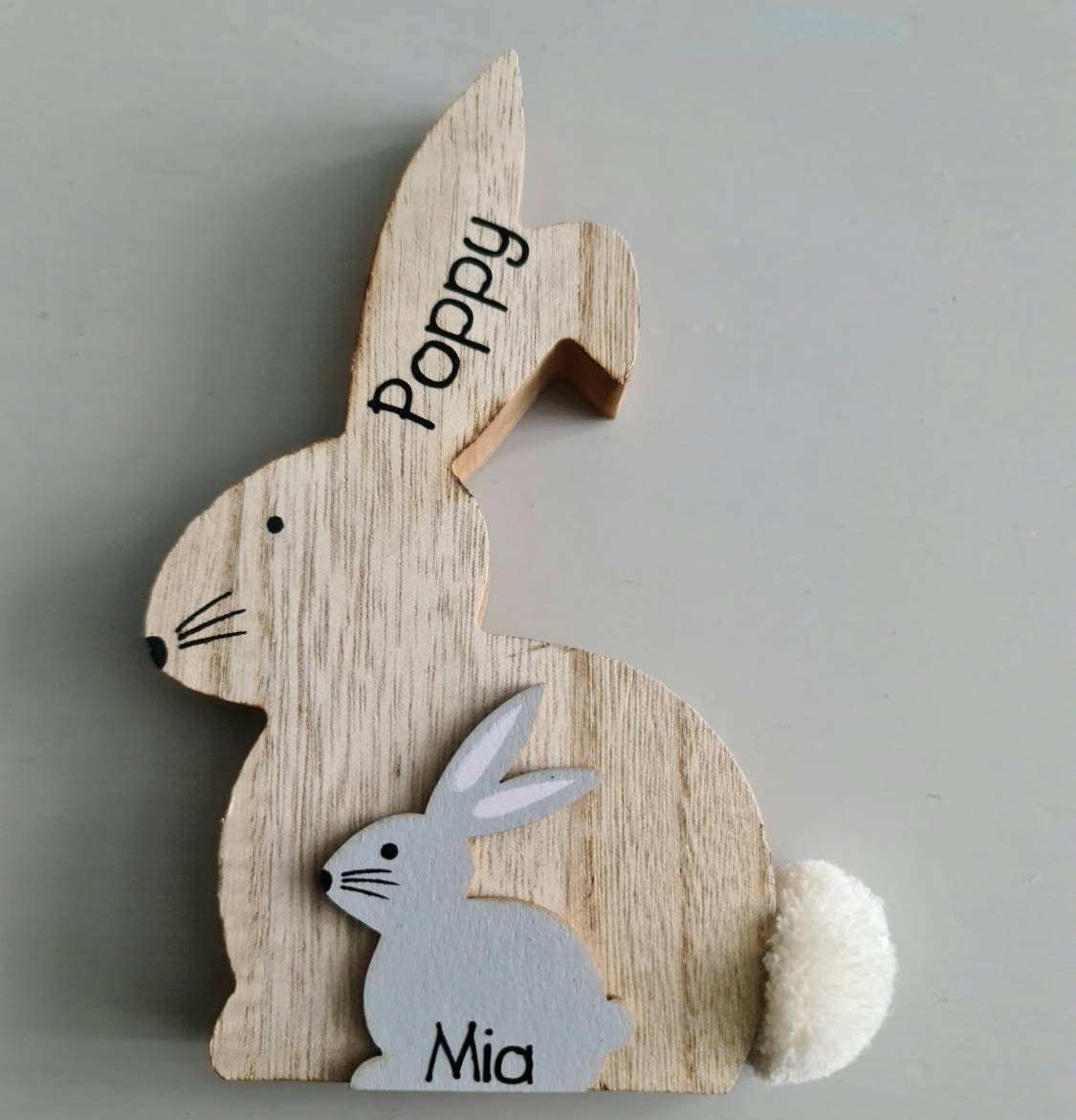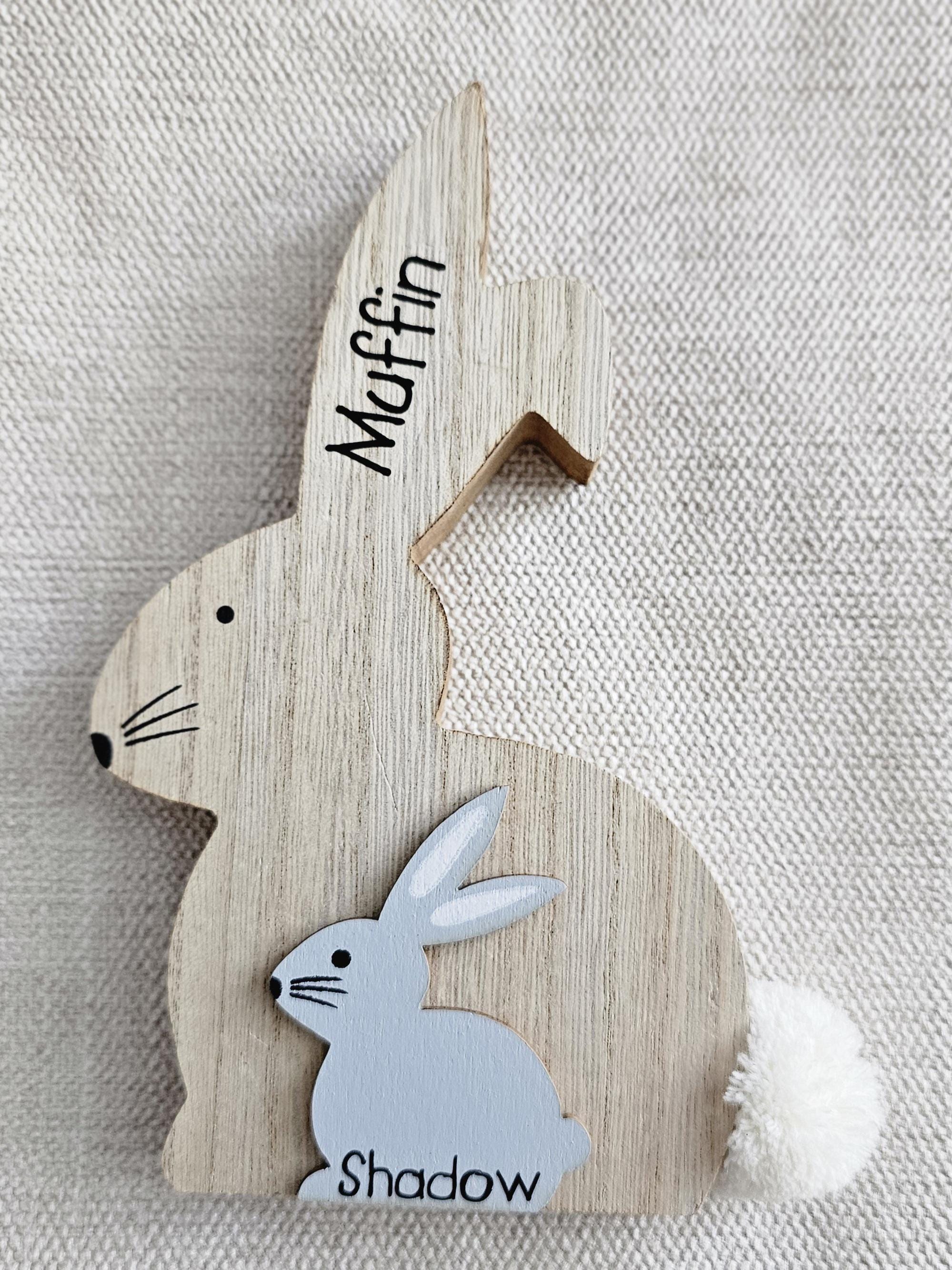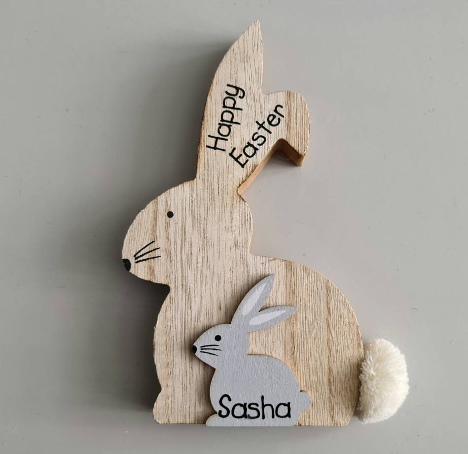 These beautiful wooden bunnies measure around 17.5 cm high, and at over 2 cm wide they are free standing. As well as the cute fluffy tail, the bunnies can be personalised with any name or two words on the ears, and a name on the small grey bunny. Because they can be personalised in any way they make the perfect present for Birthday's, Easter or Christmas. Don't forget to check out our other items to see more personalised gifts.